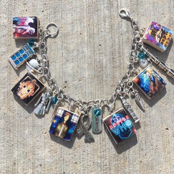 A newly designed charm bracelet for all the Dr. Who fans out there! This charm bracelet is definitely a statement piece celebrating the most famous time traveler in "history", Doctor Who! Eco-friendly, the photo charms are designed using authentic recycled Scrabble tiles!