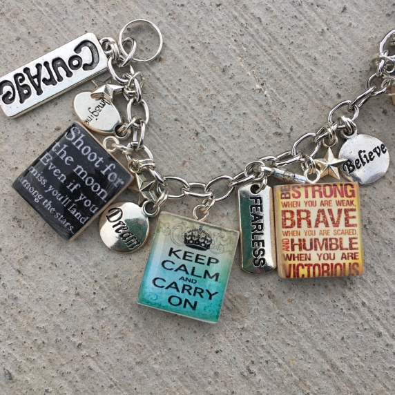 This original design charm bracelet uses authentic upcycled Scrabble tiles. The wood tiles spell "BELIEVE"on one side with vibrant artwork of motivational phrases on the reverse. The tiles are coated with an epoxy glaze that provides durable protection and a glass-like finish. Silver plate chain link bracelet is 7.5 inches long and has a lobster claw clasp. (Size can be adjusted--just ask!)